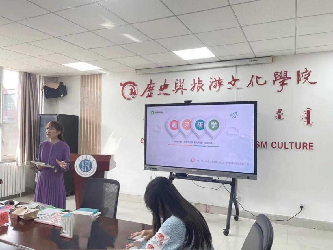 典礼结束后,公司特别安排了别开生面的“开学第一课”,由内蒙古敕勒林海文化教育科技有限责任公司经理、敕勒林海自然教育基地负责人张潇主讲。张总以“遇见研学”为主题,从研学旅行概念及相关政策解读出发,深入剖析了当前研学旅行市场的发展趋势以及面临的变革与机遇,并以敕勒林海自然教育基地为案例,就研学基地运营管理、研学课程设计、研学课程体系建设等问题与师生们进行了深入的交流与探讨,为新生们的学术之旅和人生新篇章拉开了序幕。