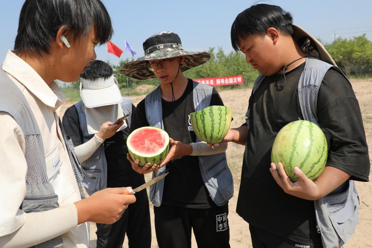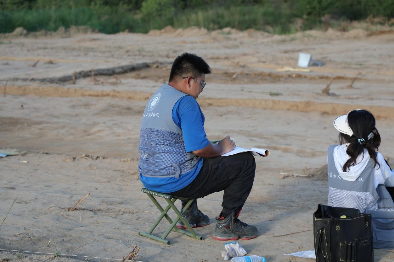 驻地的生活固然惬意快乐,但在发掘现场,同学们面对的也并非是枯燥乏味的工作。大家除了头顶烈日,脚踏黄土地认真发掘,在休息时也常聚在一起分切好的西瓜,互相交流发掘中的收获与体会。每日临近傍晚,同学们便轮流学习无人机拍照,写探方日记以记录当天的工作。