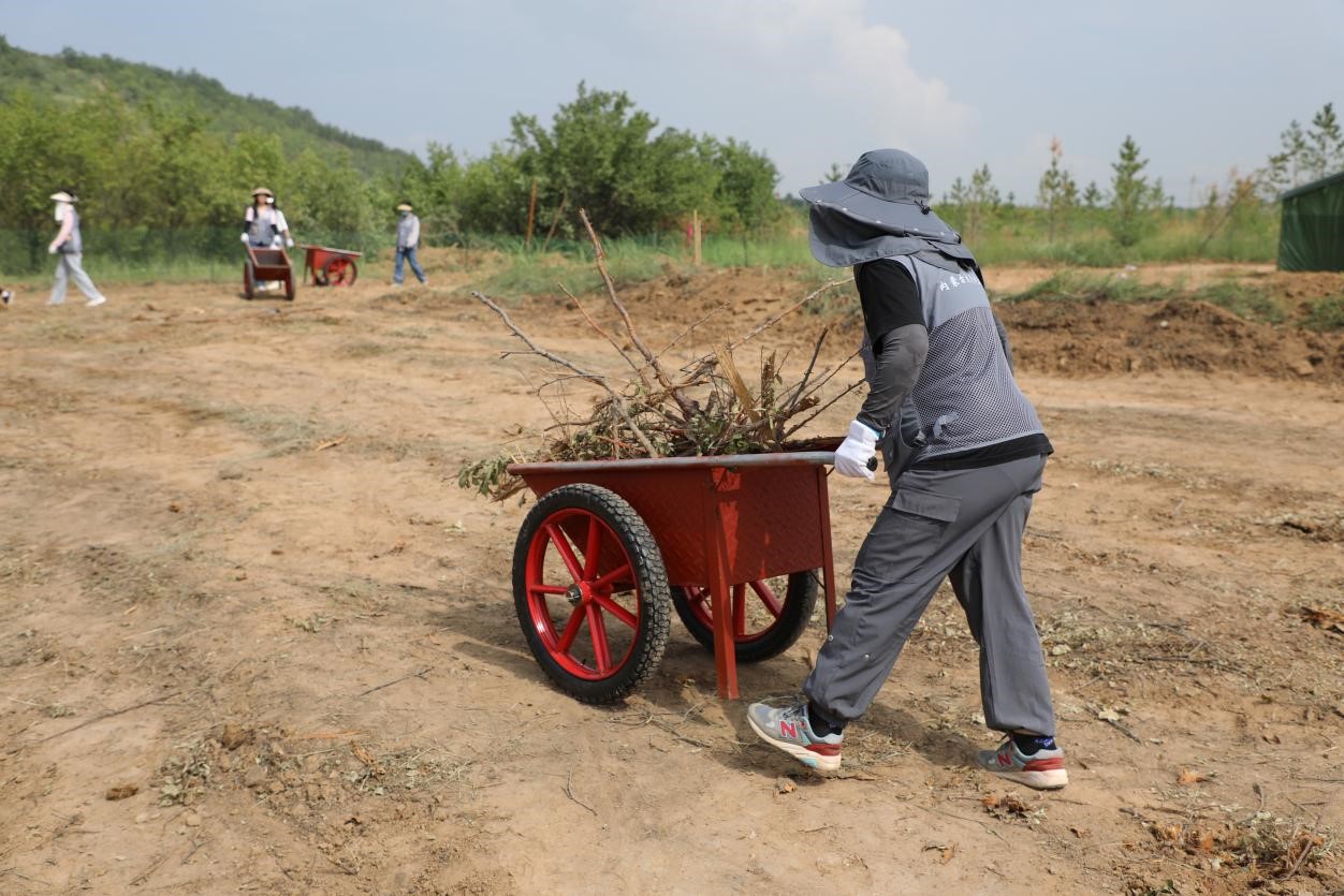 发掘区域原是当地村民的果树林,在发掘前,已经进行了初步的清理,但仍残留有不少的树木根茎和枝杈,在到达工地后,同学们推起小推车,和民工叔叔阿姨们一起开始了清理工作。此后,同学们又进行了RTK测量和布方工作的学习。