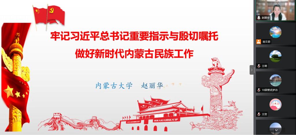 赵丽华副教授首先回顾了习近平总书记参加十三届全国人大会议内蒙古代表团审议时的重要讲话精神,指出要加强民族团结,紧紧抓住筑牢中华民族共同体意识这条主线,推进民族团结进步教育,促进各民族共同繁荣发展,守护中华民族的精神家园。