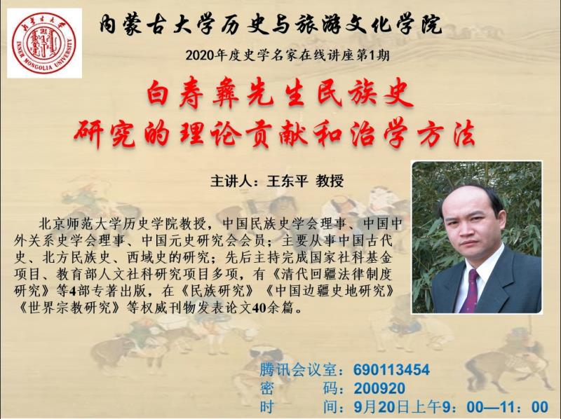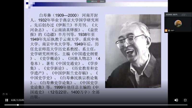 2020年9月20日上午,北京师范大学历史公司教授、博士生导师先生应邀做客公司2020年度史学名家在线讲座,为师生们做“白寿彝先生民族史研究的理论贡献和治学方法”的学术讲座。