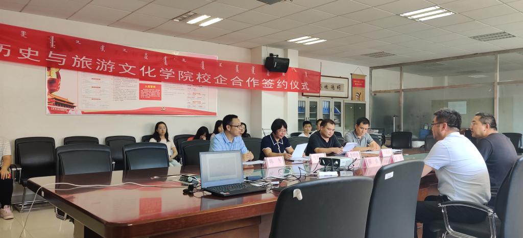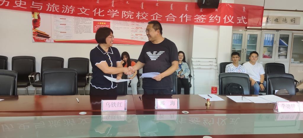 2020年8月24日下午,内蒙古陆游房车科技有限公司总经理郭海、内蒙古辉腾锡勒旅游文化股份有限公司总经理蔡勇,db旗舰官网登录入口副经理乌铁红、李德锋,旅游学系主任韩冬、旅游管理专业教师卫银栋出席签约仪式。
