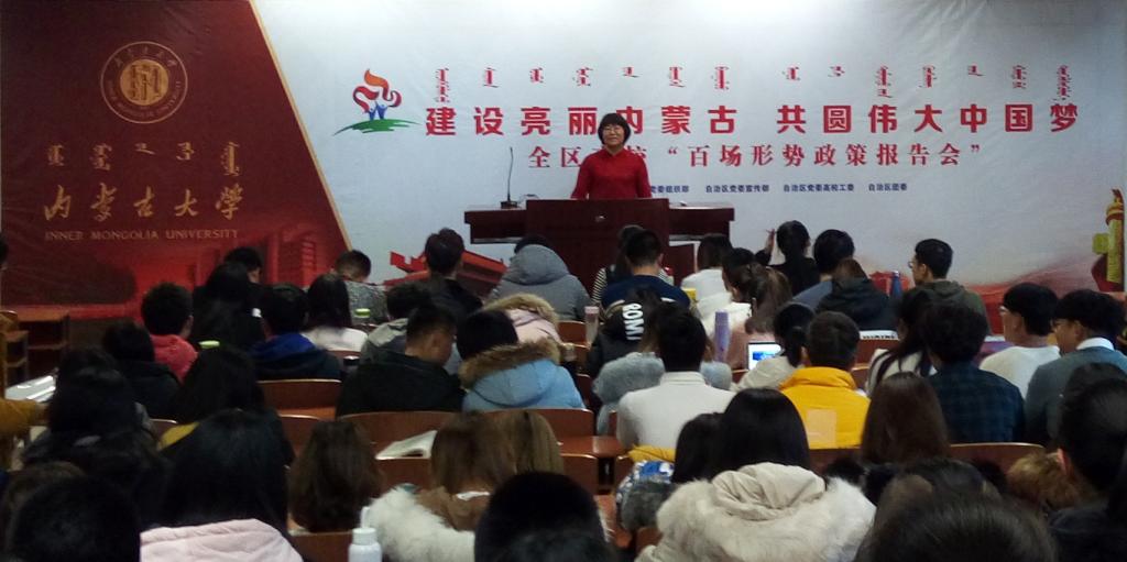 2018年11月29日下午,由db旗舰举办的建设亮丽内蒙古共圆伟大中国梦百场形势政策报告会在db真人南校区DF0301举行。公司党总支书记梁文美主持报告会,db旗舰副经理乌铁红教授做“内蒙古全域旅游发展机遇与挑战——从民众的幸福感说开去”专题报告。db真人师生200多人参加了报告会。