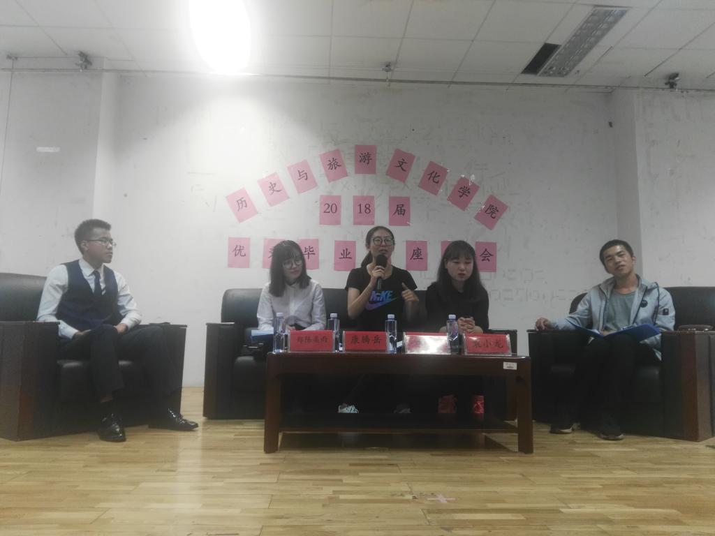 本次座谈会邀请到优秀毕业生:14级旅游管理郑陈柔雨、14级文史哲基地班(哲学方向)康腾岳、14级文物与博物馆学王卓和14级历史学袁小龙。郑陈柔雨主要介绍和分享了保研中面试的经验;康腾岳讲述了参与高校夏令营的优势劣势和分享了作为员工干部,如何兼顾学习和员工工作;王卓分享应该以何种心态备战考研,袁小龙主要分享了自己备考和面试的心理历程。