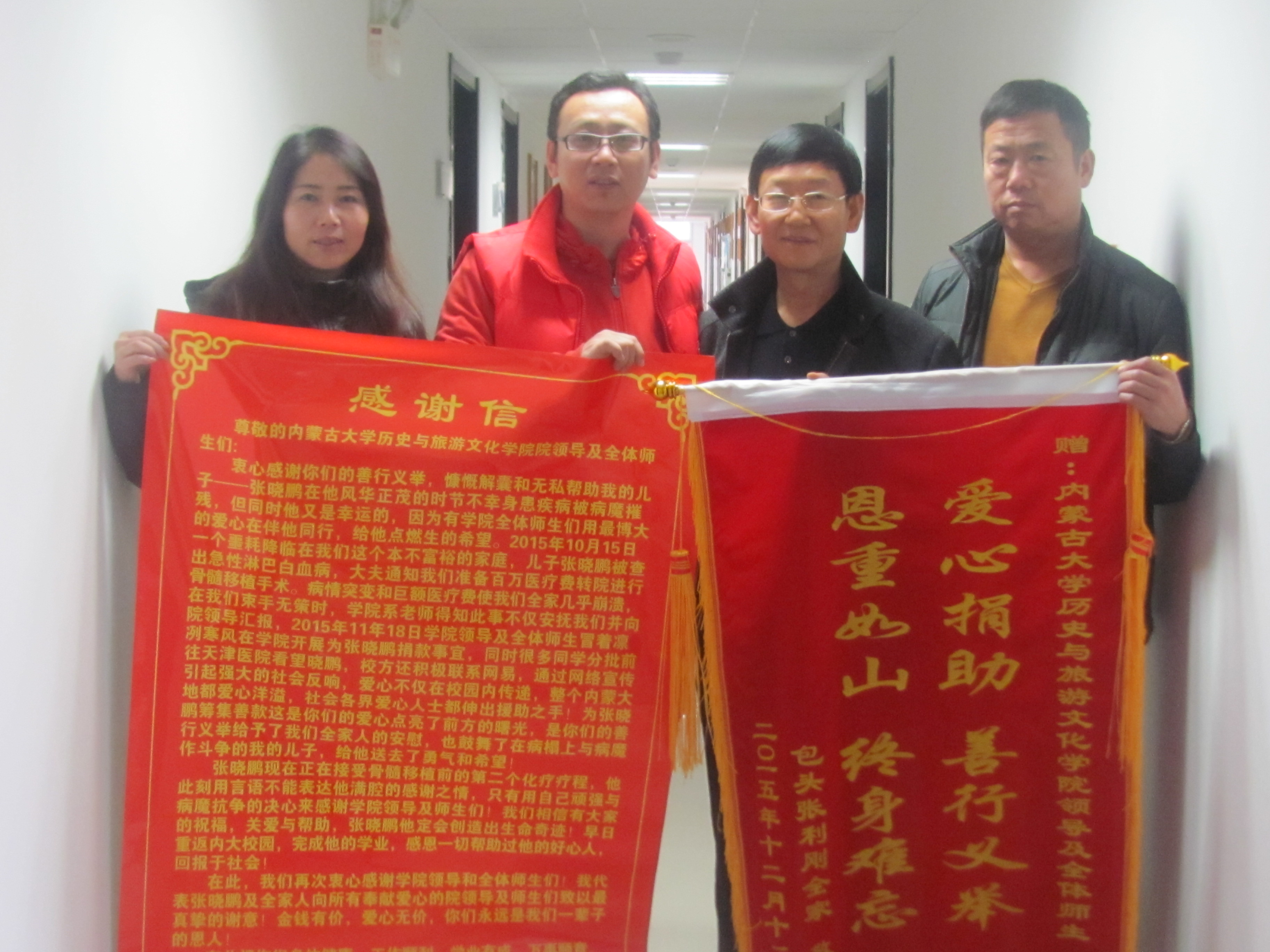 12月17日上午,db旗舰历史学张晓鹏同学的家长,把写着“爱心捐助 善行义举 恩重如山 身难忘”的锦旗及感谢信赠送给了db旗舰,党总支梁文美书记代公司接受了锦旗。