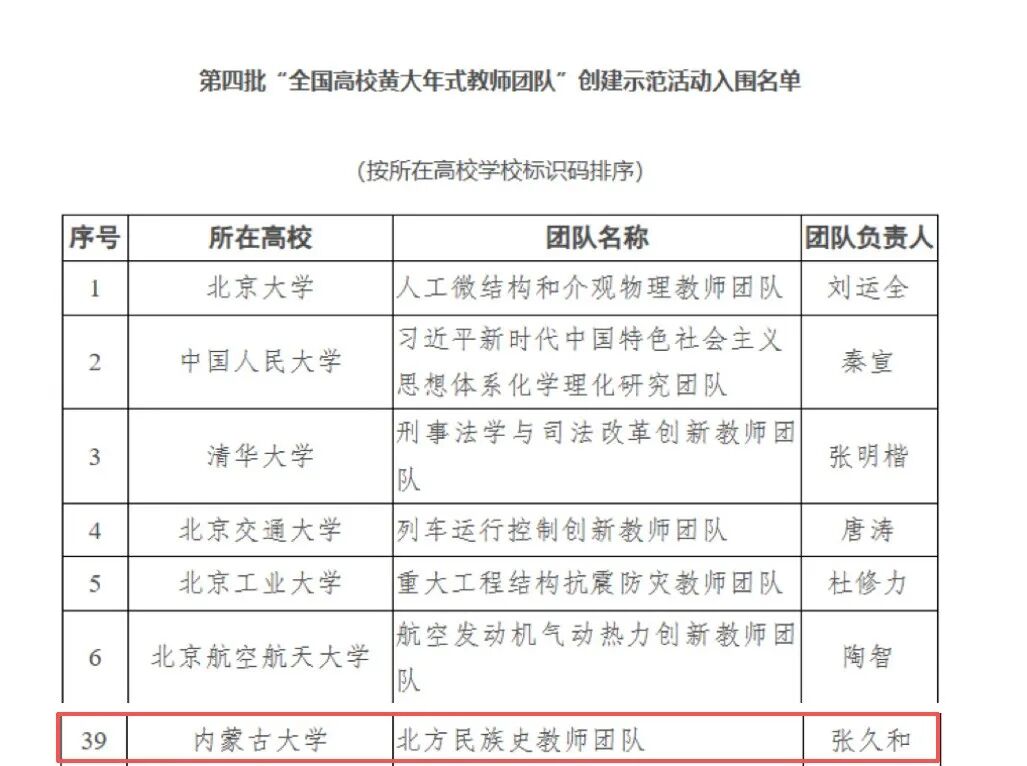 公司北方民族史教师团队入选教育部第四批“全国高校黄大年式教师团队”