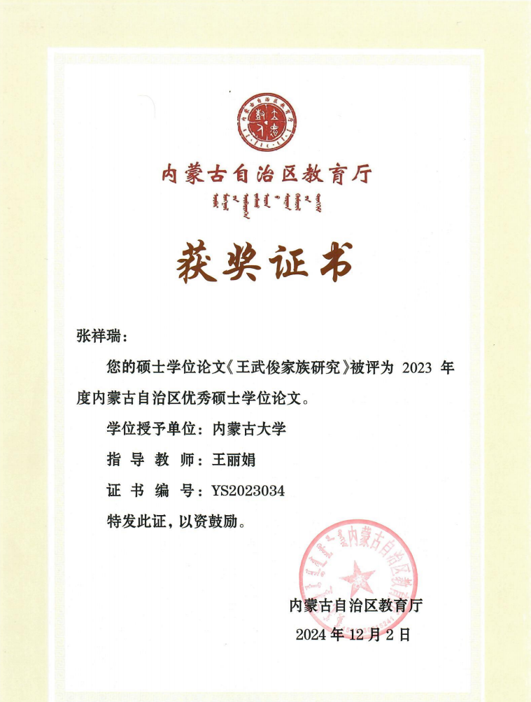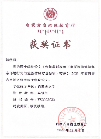 近日,内蒙古自治区教育厅公布了2023年度内蒙古自治区优秀博(硕)士学位论文评选结果。公司在评选中获得佳绩,共有2篇硕士学位论文获评内蒙古自治区优秀硕士学位论文,分别为中国史专业王丽娟副教授指导的硕士学位论文《王武俊家族研究》(员工:2020级张祥瑞);旅游管理专业乌铁红教授指导的硕士学位论文《价值共创视角下草原旅游地游客亲环境行为与旅游体验质量研究》(员工:2020级韩秋晨)。