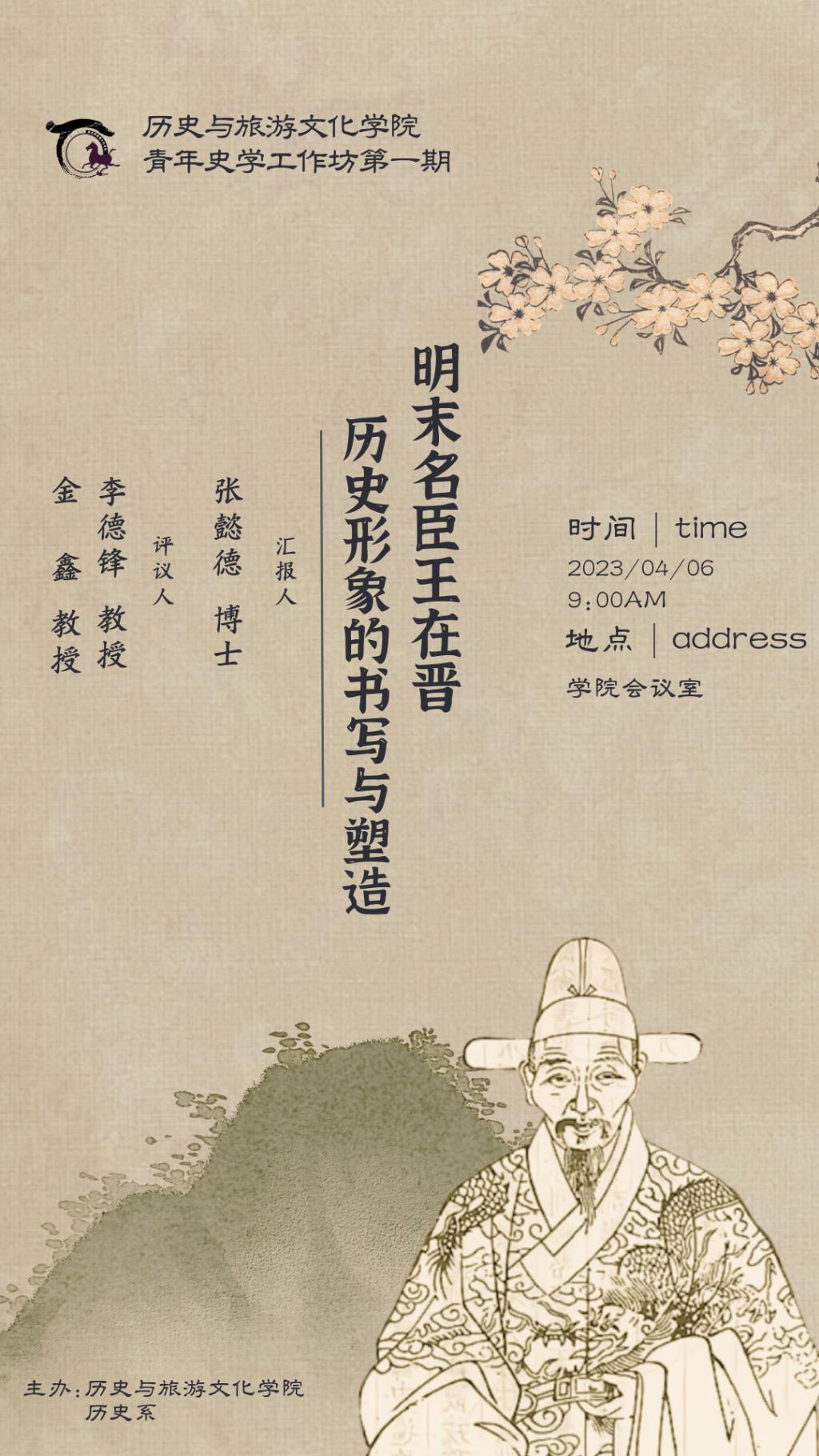 2023年4月6日上午,db旗舰历史系主办的第一期“青年史学工作坊”在公司会议室F3004举行。“青年史学工作坊”是面向历史系青年教师开展的系列学术活动,旨在通过学术讲座的形式提高青年教师的学术水平,为全系教师搭建沟通交流的平台。本期工作坊由历史系青年教师张懿德博士进行汇报,题目为《明末名臣王在晋历史形象的书写与塑造》。历史系主任王星晨老师主持活动,db旗舰经理李德锋教授、历史系金鑫教授担任评议,历史系教师胡玉春、王丽娟、王安宇、白坤、宋文、刘一奇及本科生、研究生三十余人参与活动。