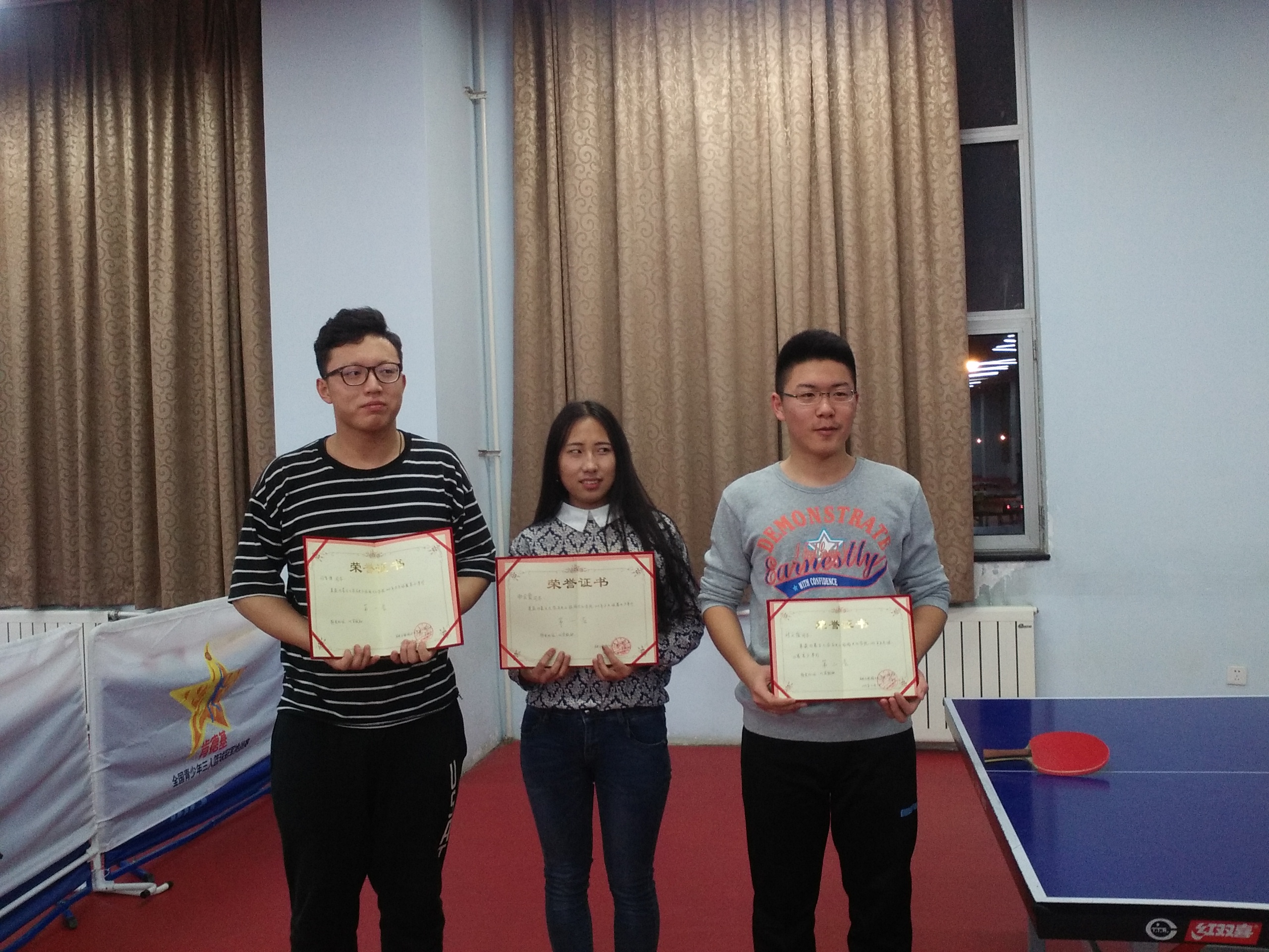 经过激烈的角逐后,来自2015级旅游管理班的闫智博获得男子单打第一名,2014级旅游管理班郝金霞获得女子单打第一名。