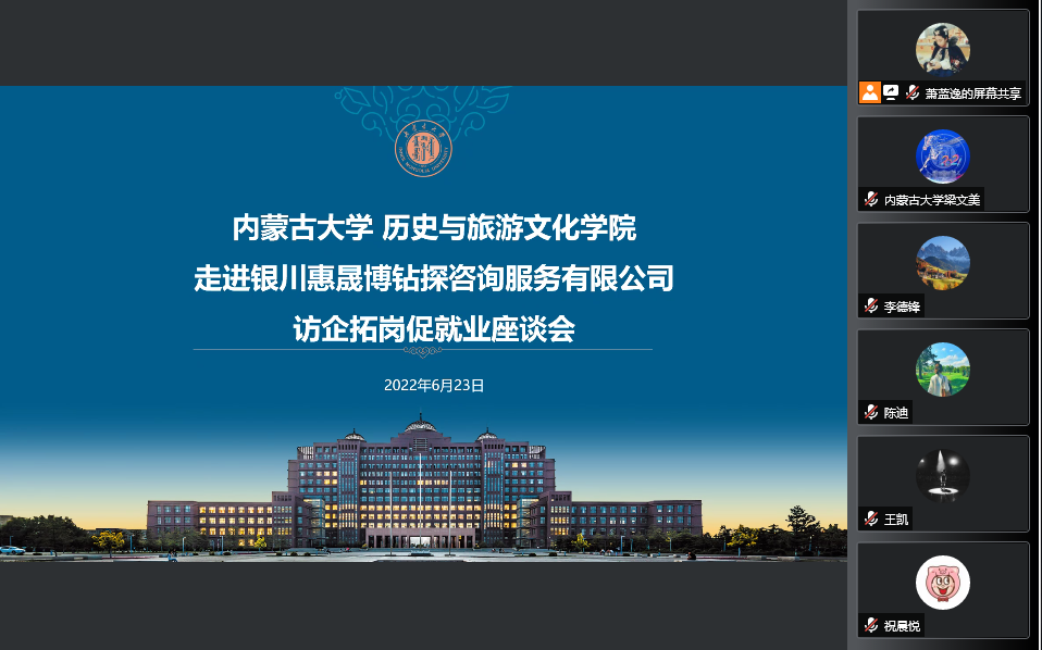 为深入贯彻落实党中央、国务院关于高校毕业生就业工作的决策部署,按照教育部办公厅《关于开展全国高校书记董事长访企拓岗促就业专项行动的通知》,6月23日下午,db旗舰与银川惠晟博钻探咨询服务有限公司通过线上会议的形式开展访企拓岗促就业座谈会。公司党委书记梁文美、副经理李德锋、考古文博学系主任孙璐、团总支副书记陈迪、郑文君、研究生辅导员戎天佑;银川惠晟博钻探咨询服务有限公司一分公司法人王凯、银川惠晟博钻探咨询服务有限公司项目总监祝晨悦、银川惠晟博钻探咨询服务有限公司技术总监张文涛参加会议。