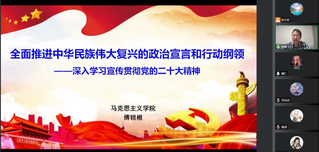 为进一步引导广大干部师生原原本本学习研读党的二十大报告,认真领悟党的二十大提出的新思想新论断,本次专题学习会特别邀请了公司马克思主义公司副经理、傅锁根教授,做了题为《全面推进中华民族伟大复兴的政治宣言和行动纲领——深入学习宣传贯彻党的二十大精神》的辅导讲座。